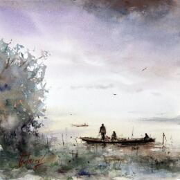 Petit matin sur la LoirePeinture Petit matin sur la Loire par Gutierrez | Tableau Impressionnisme Paysages Aquarelle