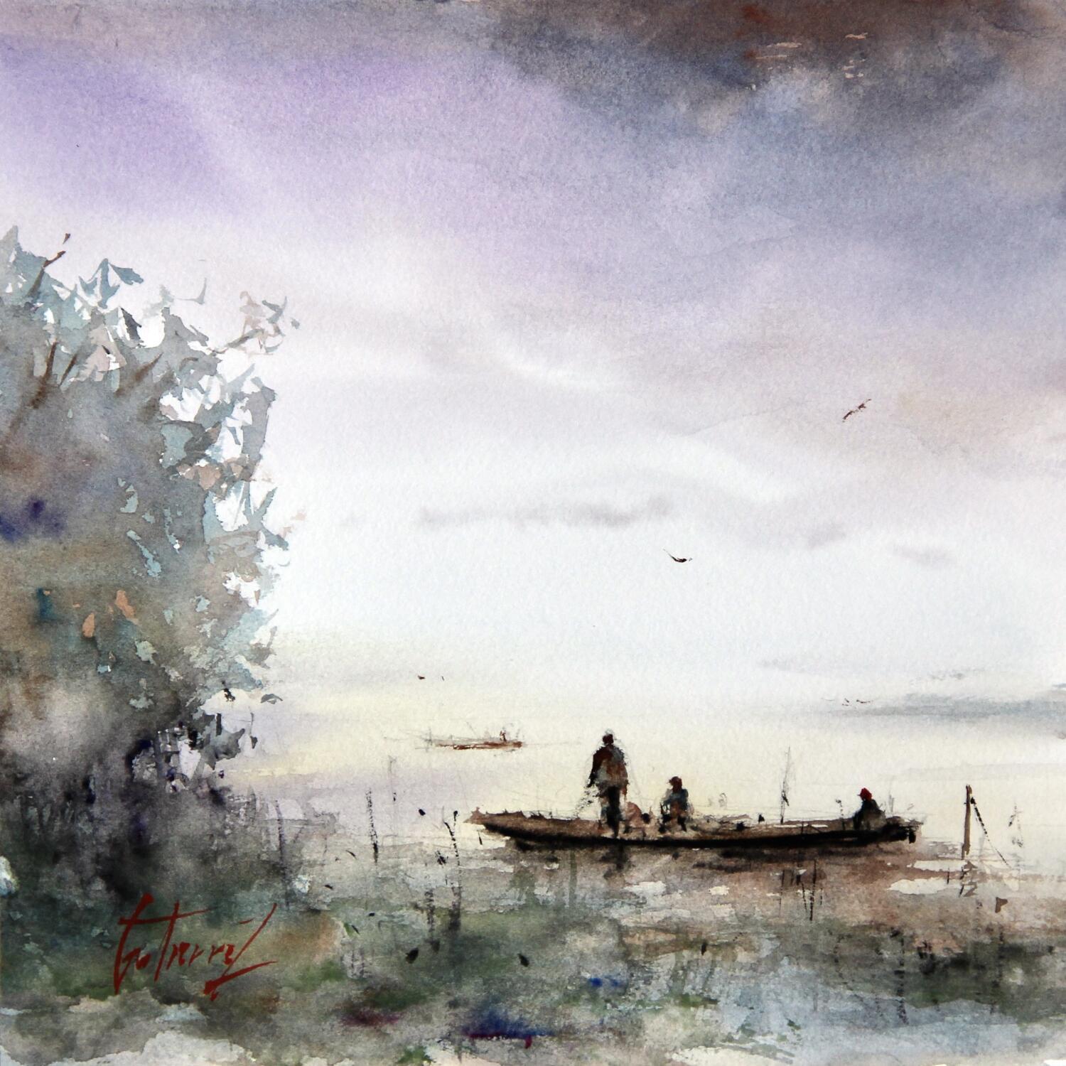 Peinture Petit matin sur la Loire par Gutierrez | Tableau Impressionnisme Paysages Aquarelle