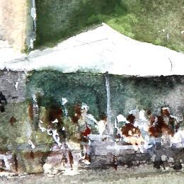 Le bar de l'UniversPeinture Le bar de l'Univers par Gutierrez | Tableau Impressionnisme Urbain Aquarelle
