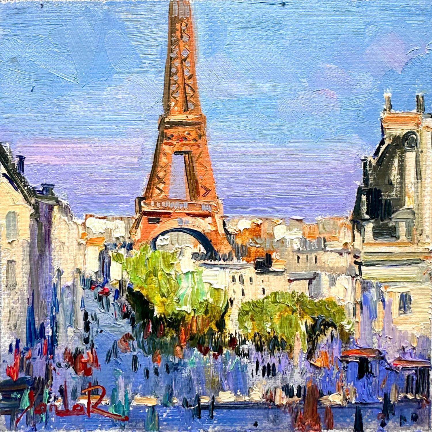Peinture “Sous la Tour Eiffel” par Xanlar | Tableau Impressionnisme Urbain Architecture Huile