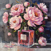 Des pivoines d'un rose tendre s'épanouissent dans toute leur beauté lumineuse, leurs pétales se déployant en riches couches, tels de la soie caressée par la lumière. Niché parmi elles, un flacon de parfum chatoyant reflète des tons cramoisis chaleureux, comme s'il renfermait l'essence même des fleurs qui l'entourent.