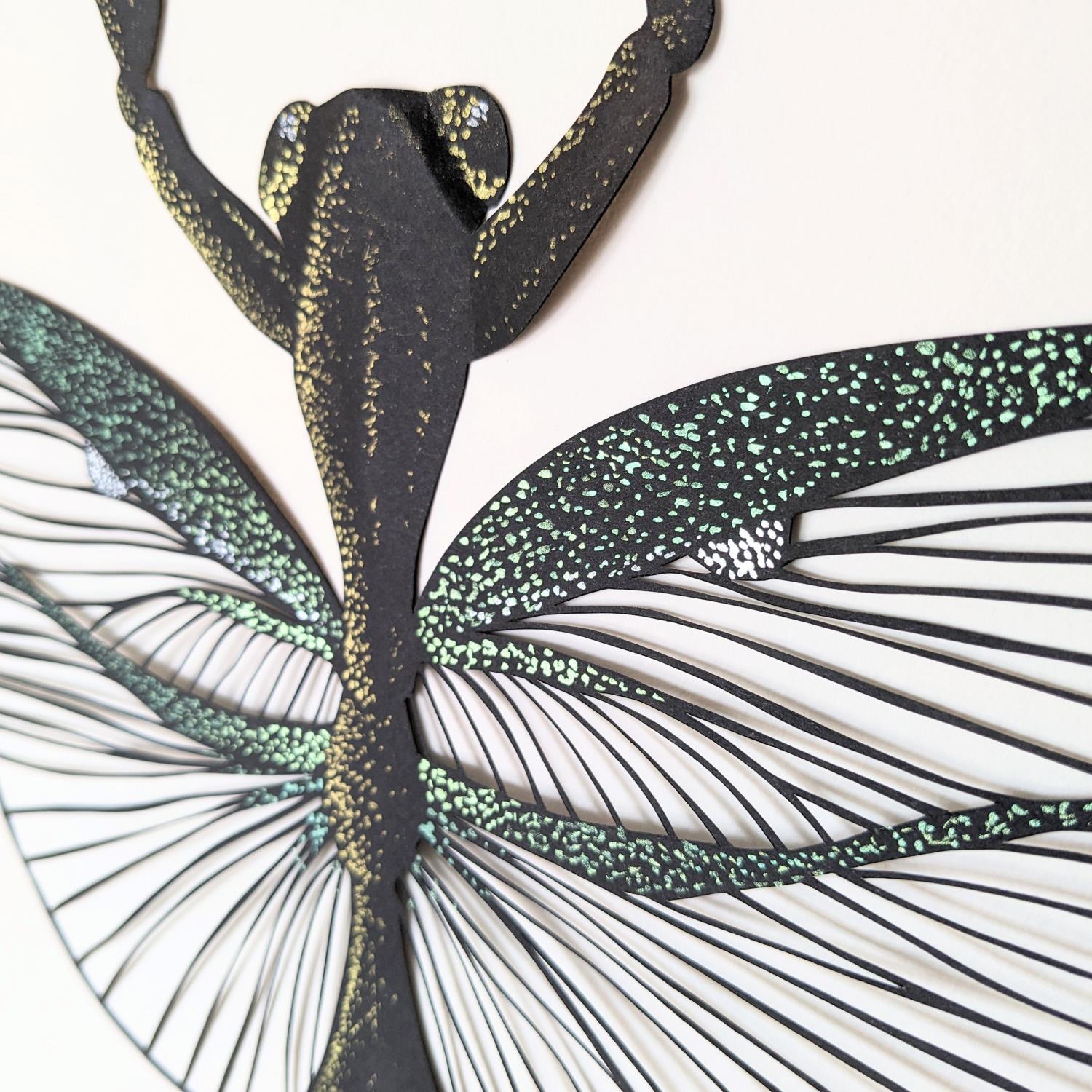 L'artiste a utilisé la technique papier découpé pour créer ce petit format au style singulier, et l'a ensuite colorisée par petites touches de peinture irisée.