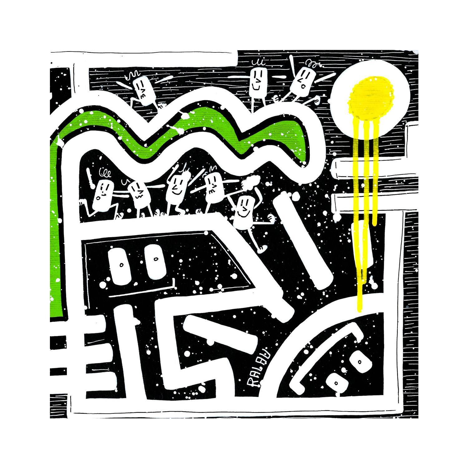 L'artiste a utilisé la technique Acrylique pour créer cette peinture petit format sur Papier de style Pop-art sur les thèmes Noir & blanc, Scènes de vie.