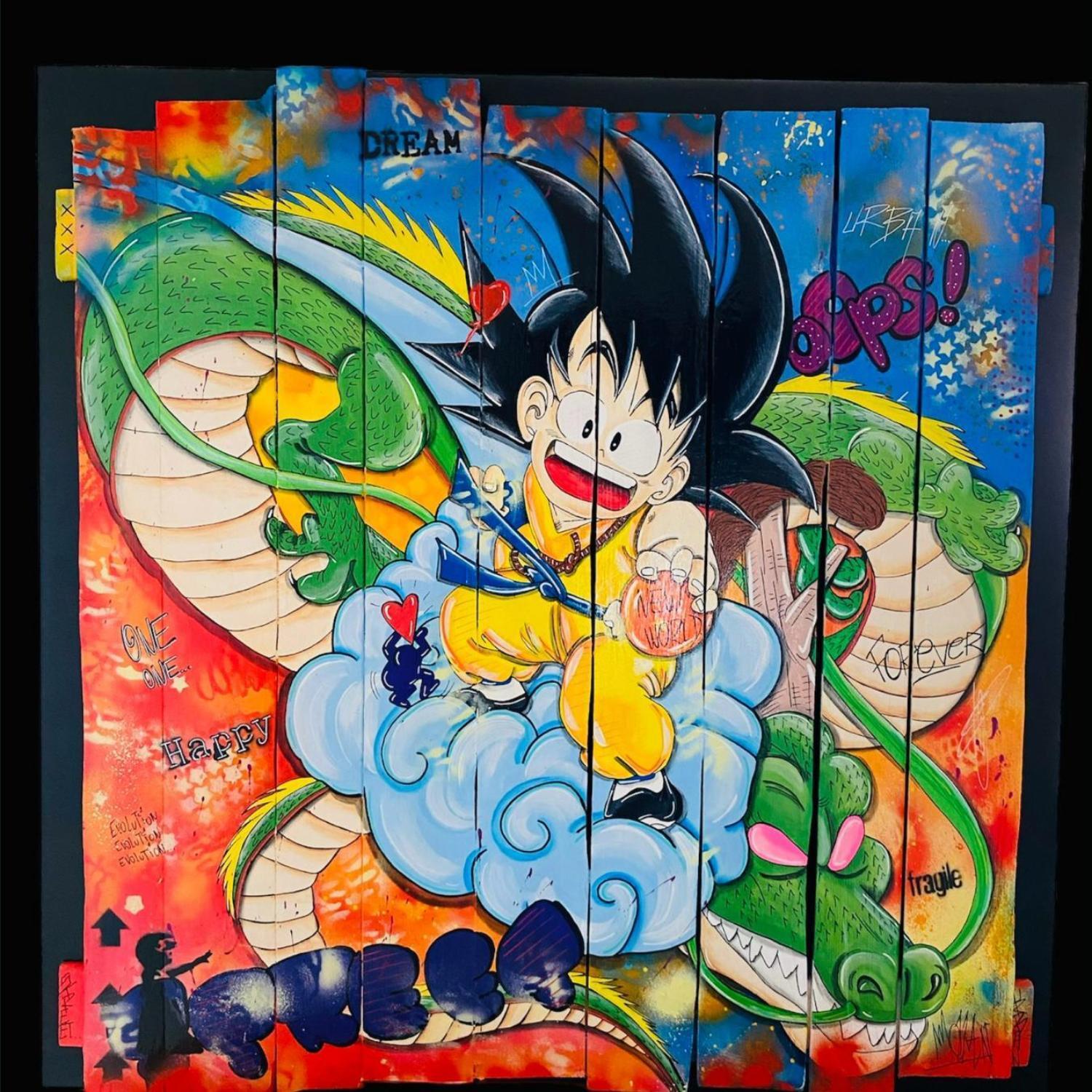 L'artiste a utilisé les techniques Bois, Acrylique, Posca pour créer cette peinture grand format sur Bois de style Pop-art sur le thème Icones Pop.