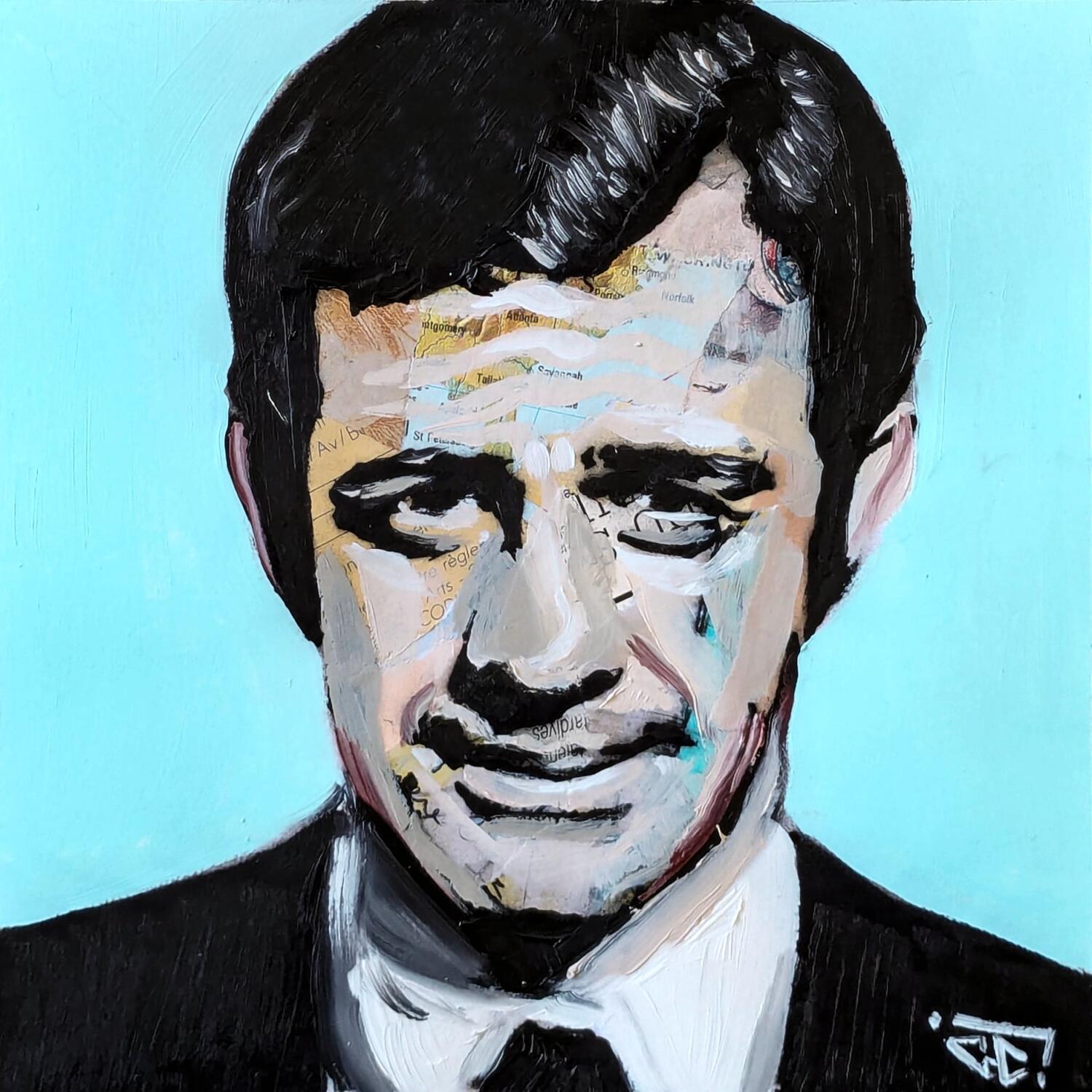 L'artiste a utilisé les techniques collage et peinture à l'huile pour créer cette peinture petit format sur Papier de style Pop-art sur le thème Icones Pop.