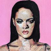 L'artiste a utilisé du papier de vieux magazines en collage et de la peinture à l'huile sur papier épais au format 13x13cm pour la réalisation de ce portrait popart.