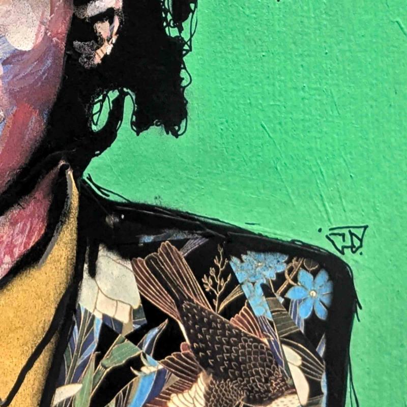 Pour sa réalisation l'artiste a utilisé du collage, de l'encre et de la peinture acrylique sur papier épais. Le format de ce portrait est 19x19cm.