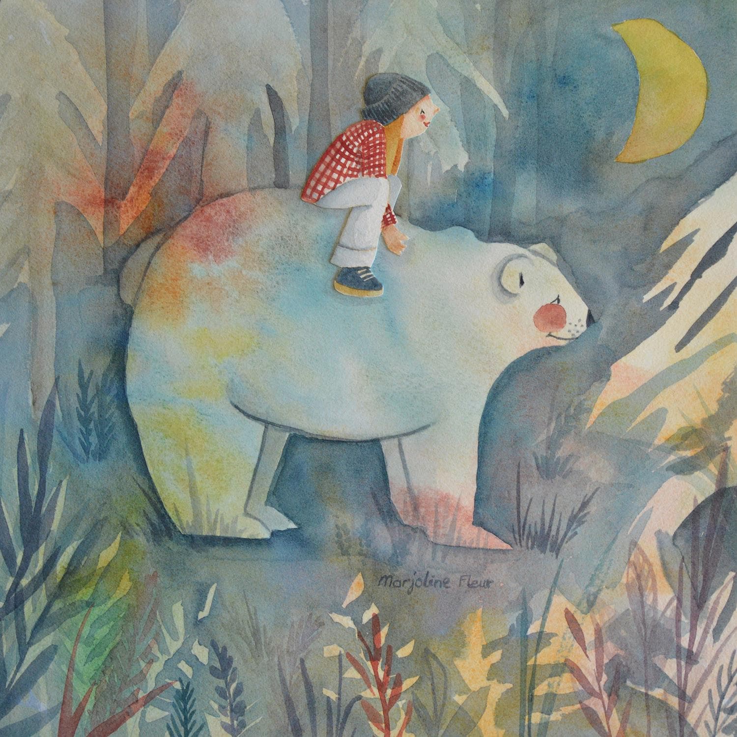 Fleur Marjoline, après des études en arts appliqués et une carrière de 12 ans comme designer textile, découvre l'aquarelle lors d'un atelier en 2012. Séduite par cette technique, elle décide de réaliser son rêve d'enfant d'illustrer des livres pour enfants et suit une formation de dessinateur-illustrateur pendant trois ans. En 2023, elle quitte son emploi salarié pour se consacrer entièrement à l'illustration et à l'aquarelle. Fascinée par l'enfance et l'imaginaire, ses œuvres captivent par leur capacité à transporter le spectateur dans des mondes enchanteurs.