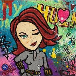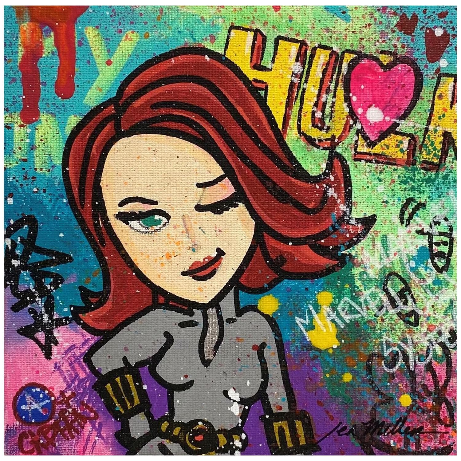 L'artiste a utilisé différentes techniques pour créer cette peinture petit format sur toile de style Street Art sur le thème icones Pop.