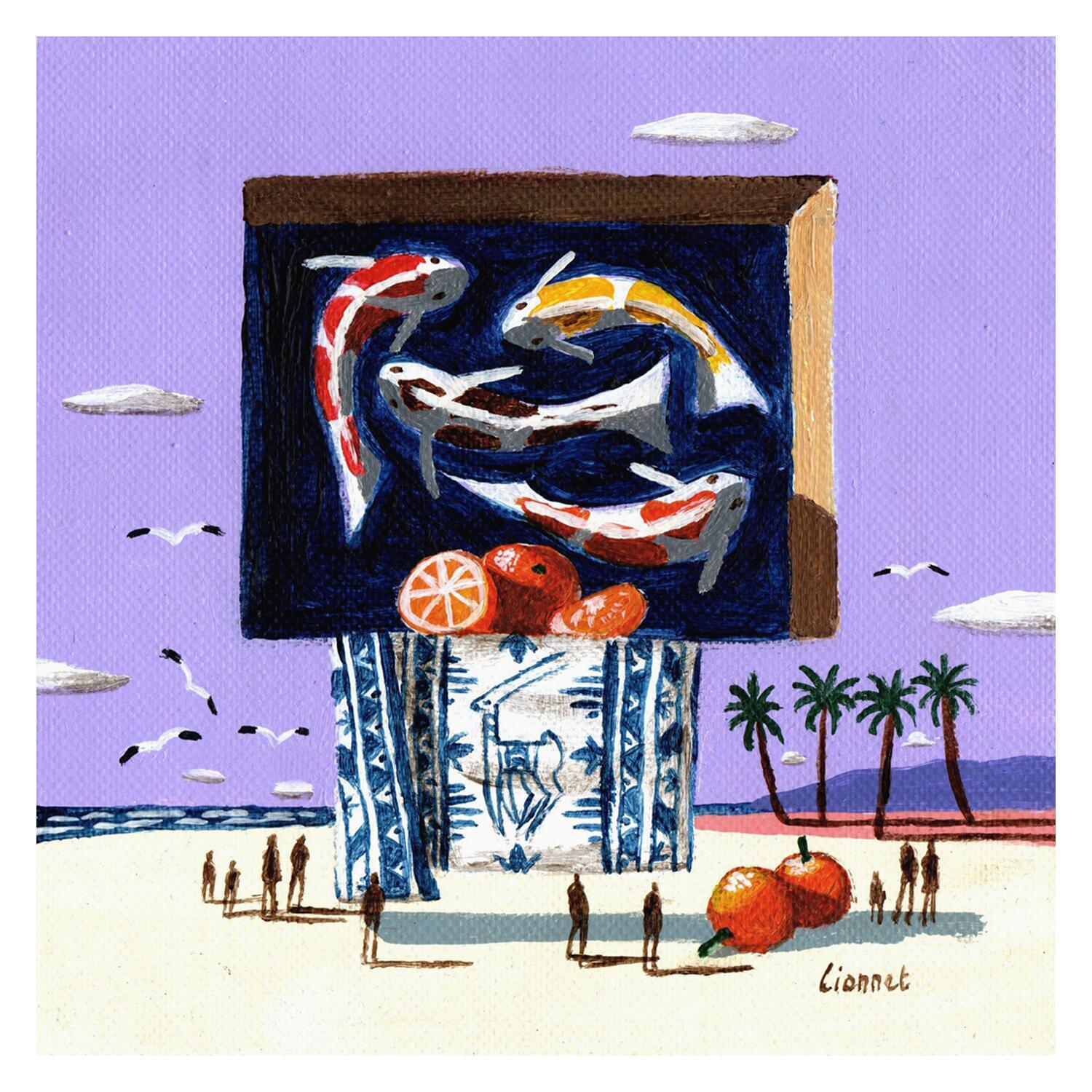L'artiste a utilisé la technique Acrylique pour créer cette peinture petit format sur Toile de style Surréalisme sur les thèmes Scènes de vie, Animaux, Marine.