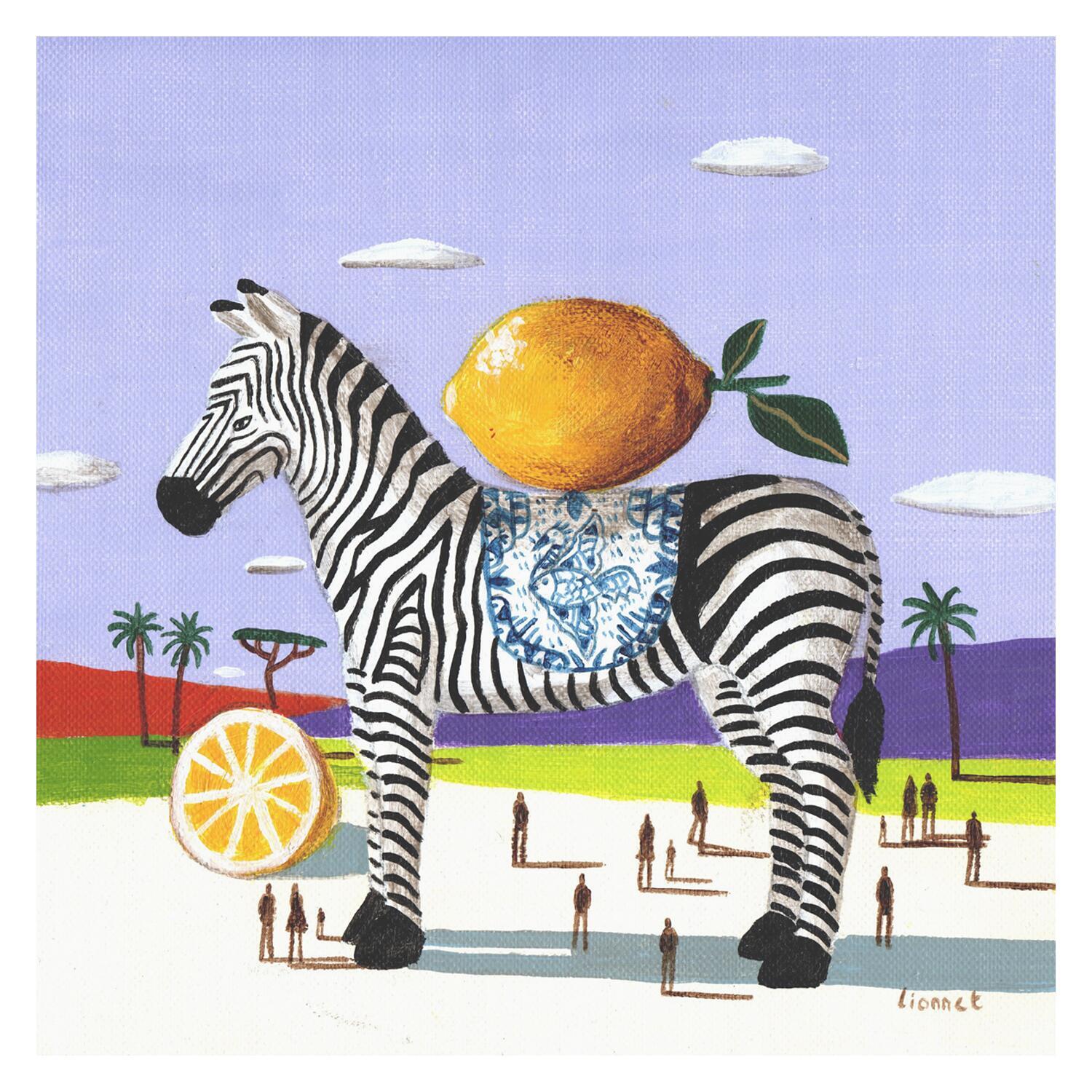 Cette oeuvre d'art contemporain unique et originale "zèbre aux citrons" a été réalisée par l'artiste contemporain Lionnet Pascal.
