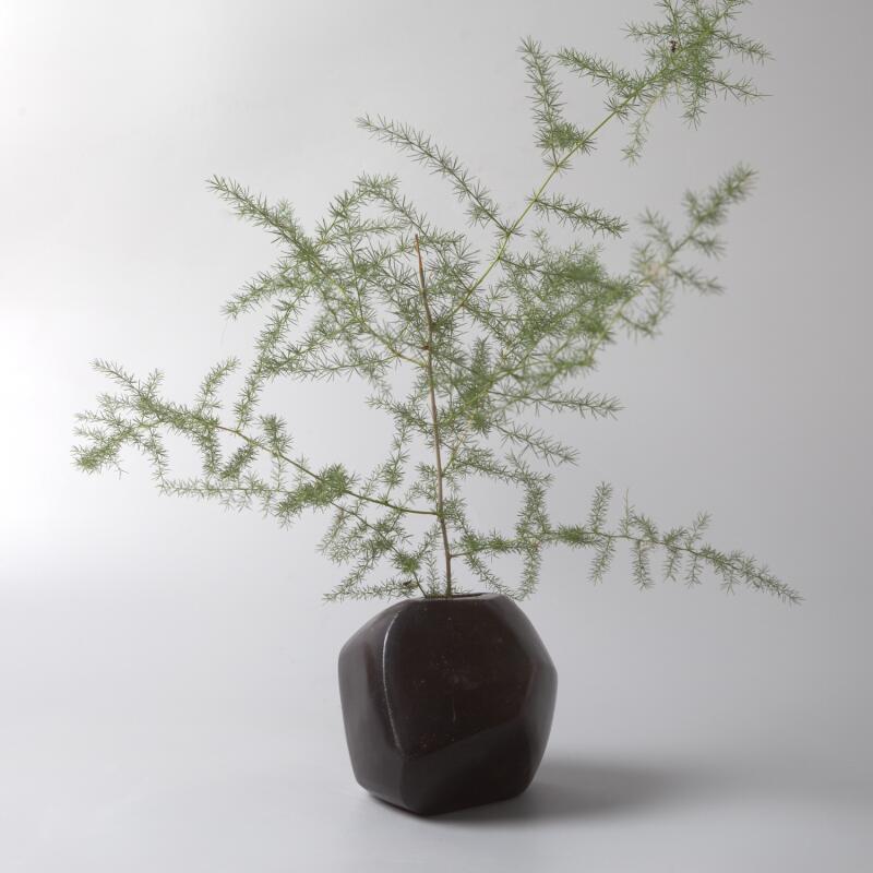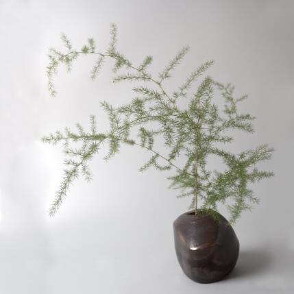 Rempli de sable ou de petites pierres, ce vase pour fleurs sèches - cuit en raku - permet d'exposer une branche ou une fleur cueillie lors d'une promenade, mettant ainsi en valeur la simplicité et l'éphémère selon la philosophie du wabi-sabi. (Il est également possible d'y insérer un tube étanche pour y ajouter de l'eau). Pièce unique.