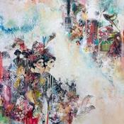 L'artiste a utilisé les techniques mixtes: collages, textures, tissus, pastels et la peinture acrylique, pour créer cette peinture petit format sur toile souple de style abstrait, surréaliste.