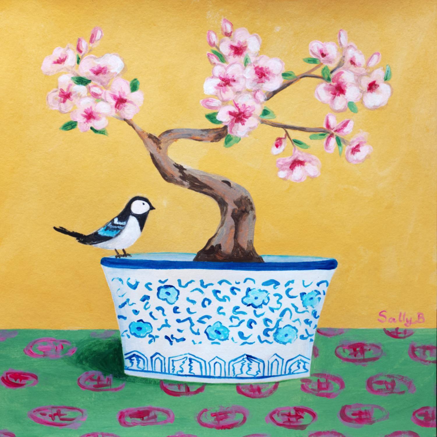 Oiseau et bonsai cerisier Peinture Oiseau et bonsai cerisier  par Sally B | Tableau Art Singulier Nature Enfant Natures mortes Acrylique