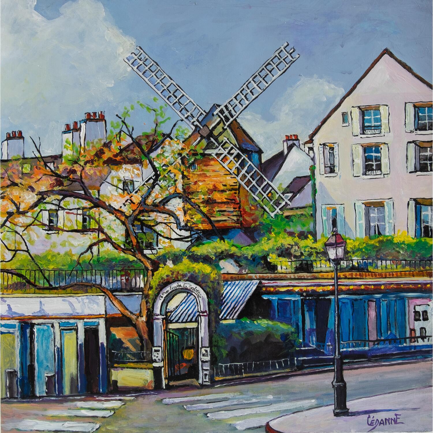 Cette œuvre d'art contemporain unique et originale, de style figuratif, a été réalisée par le peintre Cèdanne. L'artiste a utilisé différentes techniques pour créer cette peinture sur toile, et traiter cette vue du Moulin de la Galette avec le style singulier qui lui est propre.