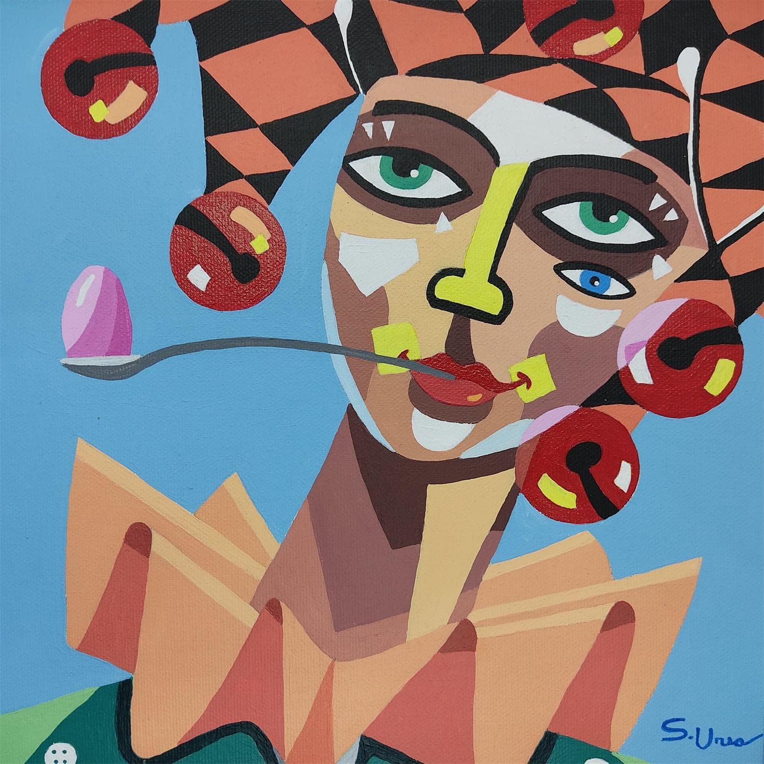 Cette oeuvre d'art contemporain unique et originale "ARLEQUIN CON HUEVO" a été réalisée par l'artiste contemporain S.Uria. L'artiste a utilisé la technique Acrylique pour créer cette peinture petit format sur toile de style Figuratif sur le thème Portraits.