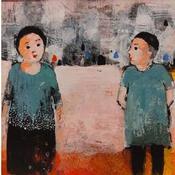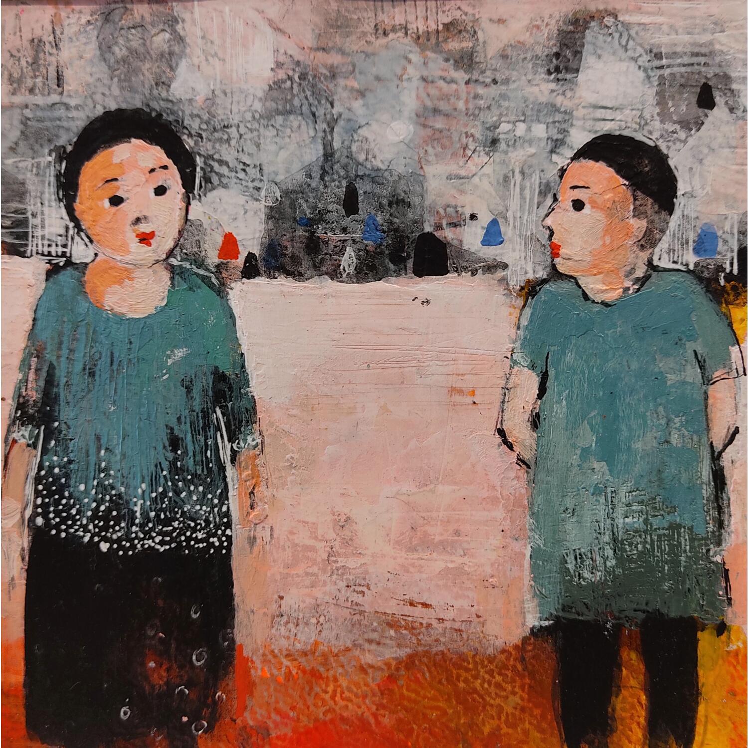 L'artiste a utilisé les techniques Collage, Huile pour créer cette peinture petit format sur Carton de style Figuratif sur les thèmes Scènes de vie, Enfant.