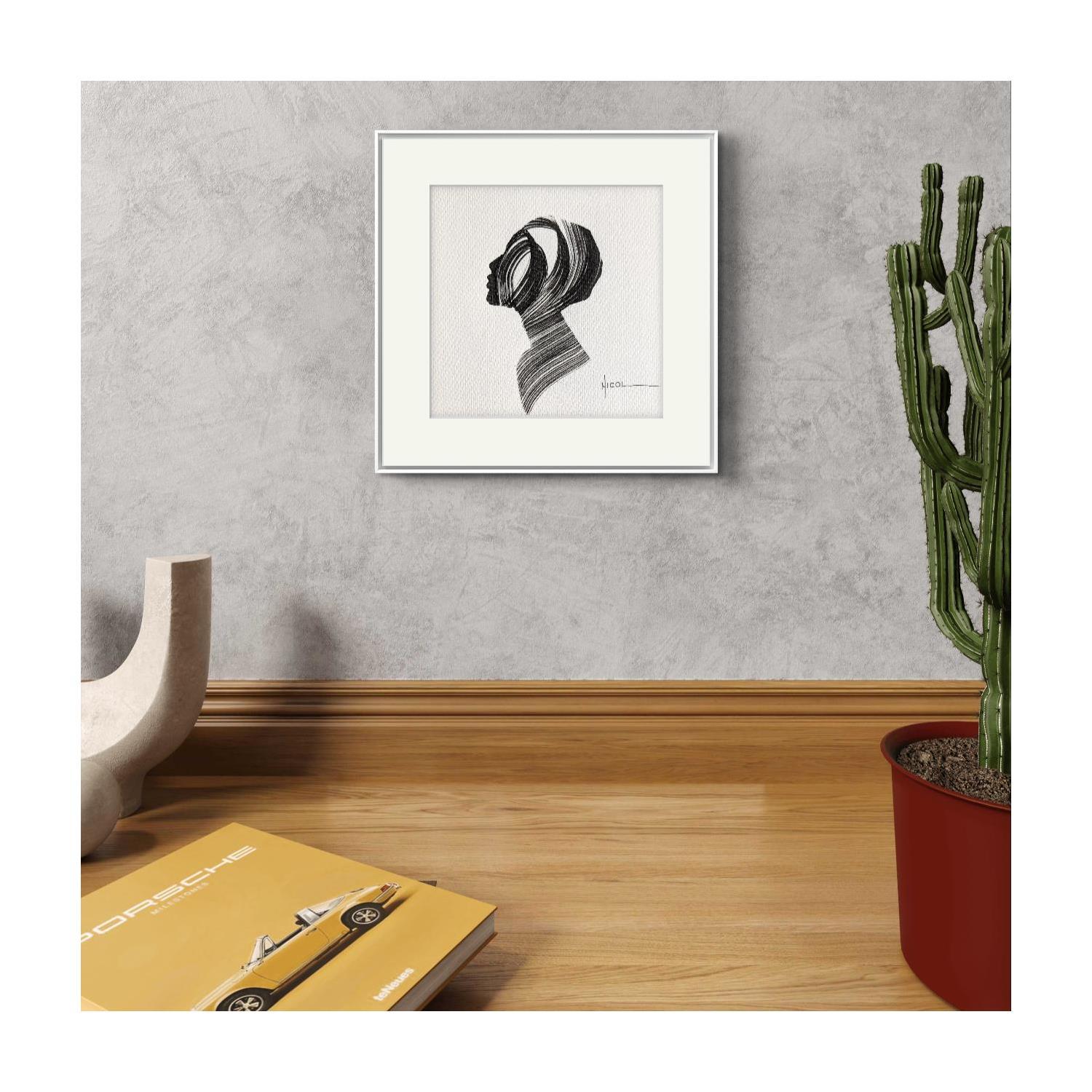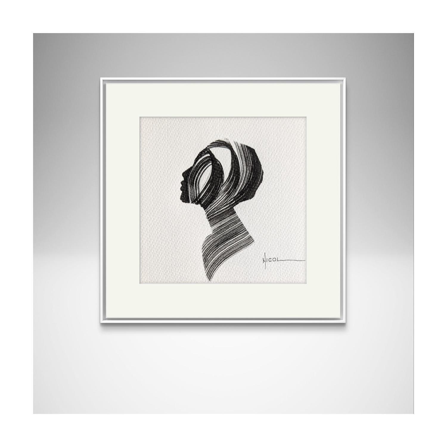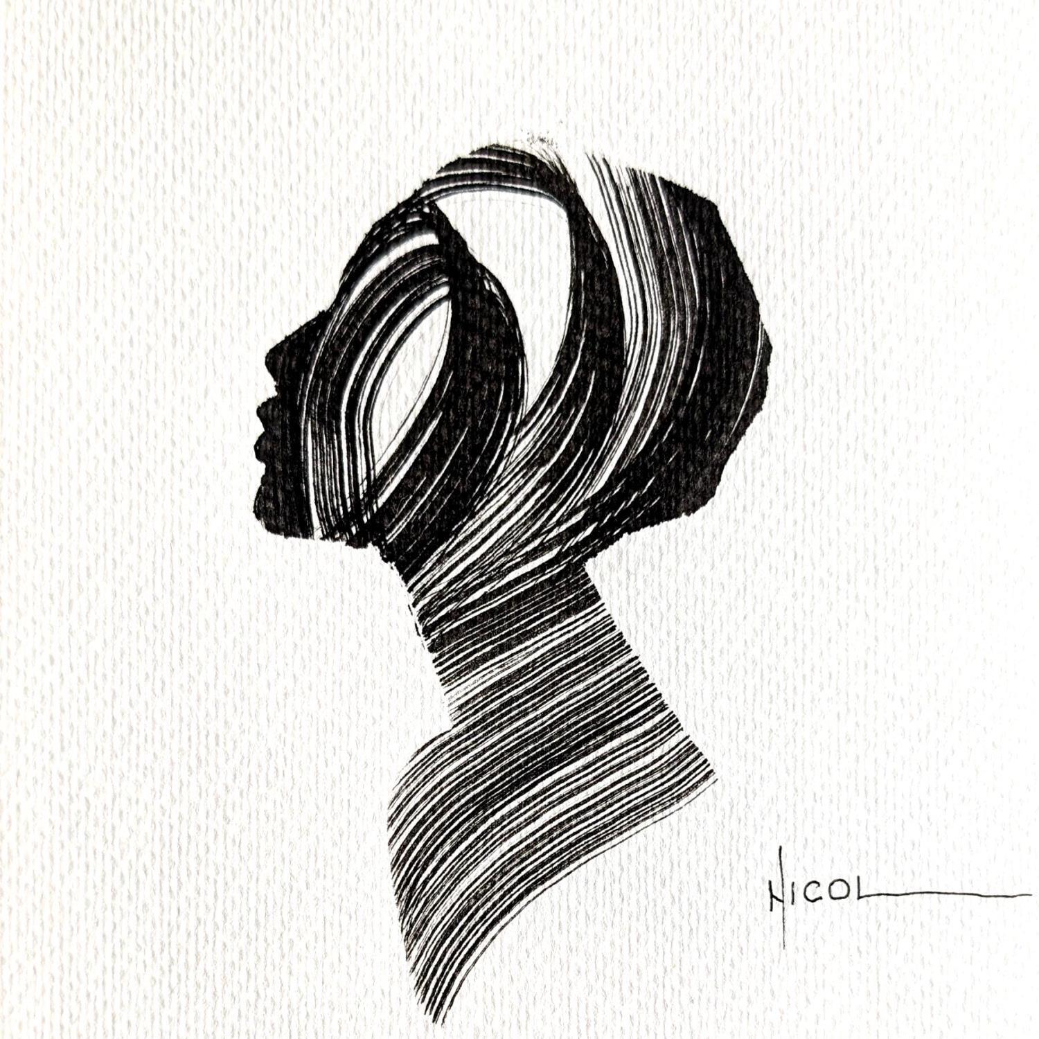 L'artiste a utilisé la technique Encre pour créer cette peinture petit format sur Papier de style Figuratif sur les thèmes Portraits, Minimaliste, Noir & blanc.