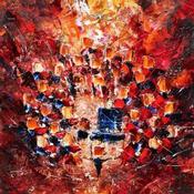 Le concert avec pianiste est une œuvre qui oscille entre abstraction dans la périphérie et art naïf dans le centre et la représentation des instrumentistes. Le motif est peint au couteau et à l'huile et joue sur sur une harmonie de couleurs chaudes (nuances de rouge, orange) et métalliques (or, cuivre, et argent...). Les têtes carrés des personnages s'inspirent de la série "Parc des Princes" de Nicolas de Staël. La mise en scène met en valeur le pianiste central et joue sur la circularité (la formation) et la verticalité (le fond). Le chef, isolé et dans une posture magistrale, conclut la partie basse de l’œuvre. L'ensemble présente une tonalité dite flamboyante ou baroque... selon les sensibilités