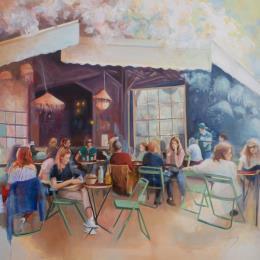 L'artiste a utilisé la technique Huile pour créer cette peinture grand format sur Toile de style Figuratif sur les thèmes Scènes de vie, Urbain.