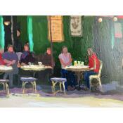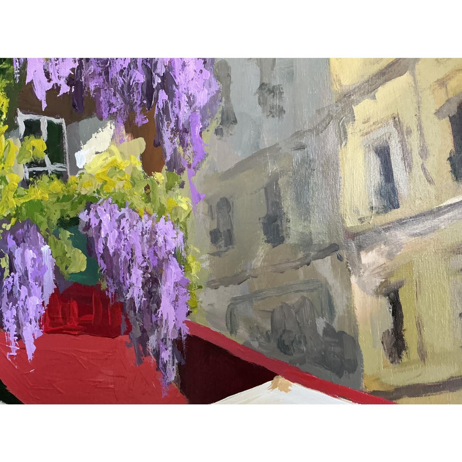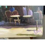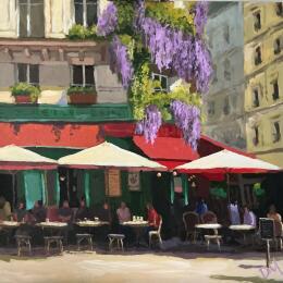 I wanted to create a sunlit scene, - the cafe ambiance, purple wisteria, dappled with light to give warmth and life.