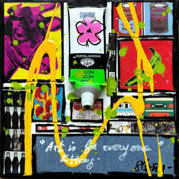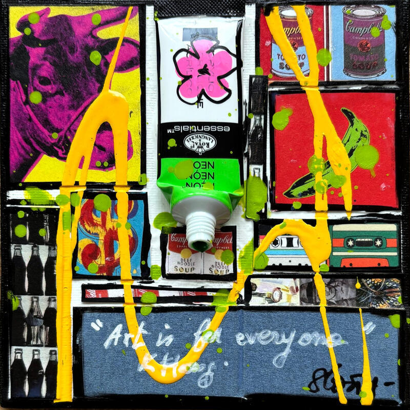 L'artiste a utilisé les techniques Acrylique, Collage, Upcycling pour créer cette peinture petit format sur Carton toilé de style Pop-art sur le thème Icones Pop.