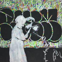 L'artiste a utilisé les techniques Acrylique, Graffiti pour créer cette peinture petit format sur toile de style Street Art sur le thème scènes de vie.