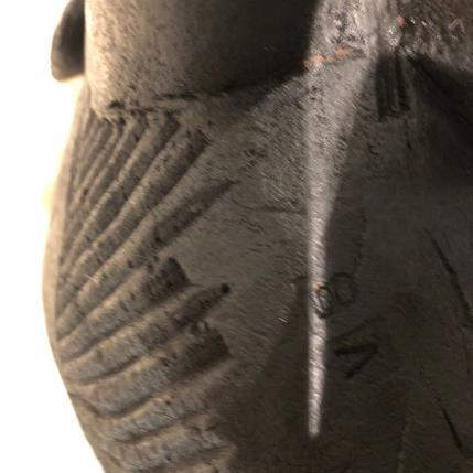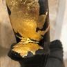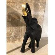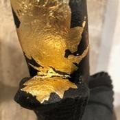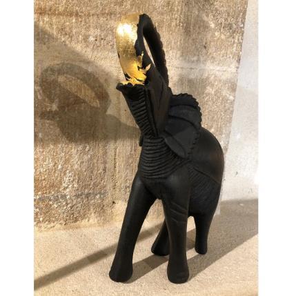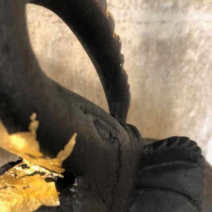 Ici, cet éléphant "ZÖ", pièce de châtaignier massif d'une ancienne charpente d'Ardèche de plus de 400 ans, sculpté et brûlé, viens offrir au monde la beauté de son imperfection. Par les touches de feuilles d’or 18 carats je ré-honore ce bois ancien.